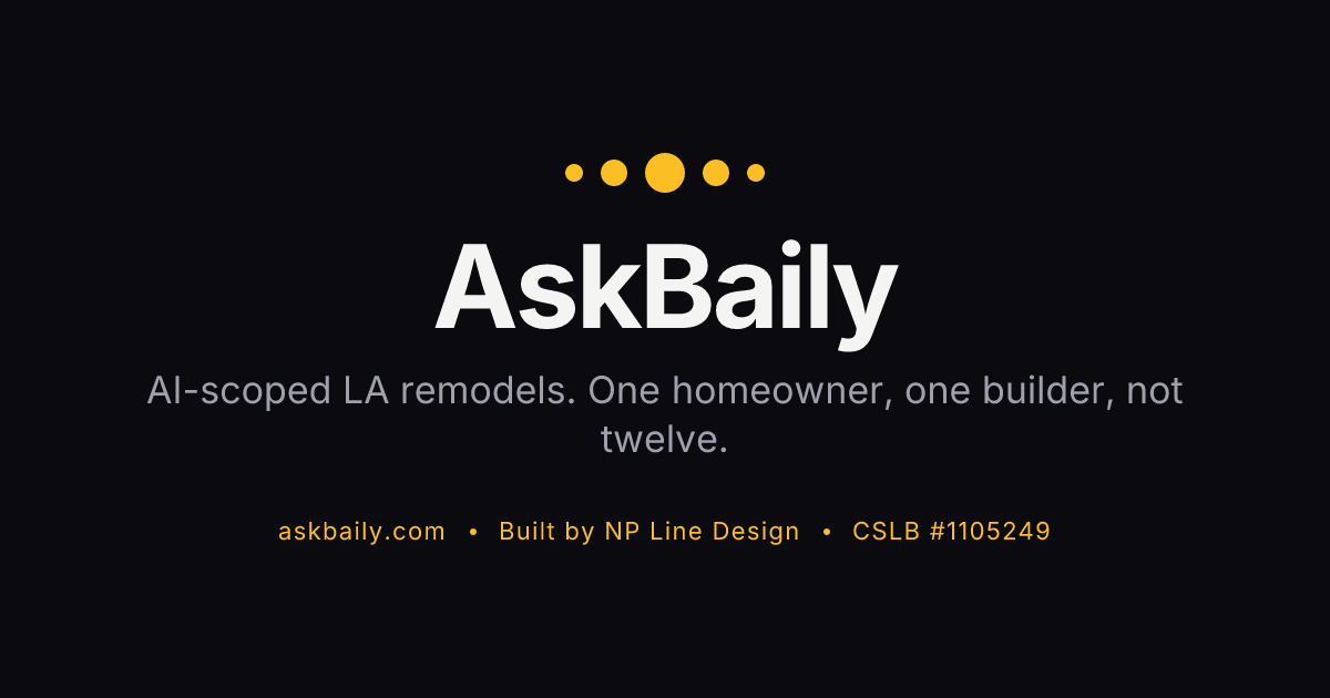 The operator behind AskBaily — NP Line Design INC, CSLB #1105249, BBB A+ accredited, 12+ years in Los Angeles general contracting — had spent years building a verification + regulatory-data layer for its own underwriting. AskBaily productizes that layer: 17 live state and international regulator integrations, 81 city-specific licensing + insurance + bond data tables, a 20-structured-question AI-indexable FAQ per city, and a public subscribable regulatory change feed that journalists use as a primary source.